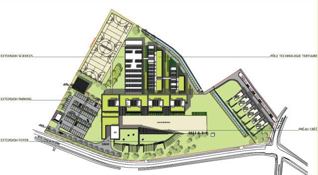 • Création de 2 bâtiments d’enseignement général à RdeC + agrandissement de la salle de restauration (1994 m² SHON)