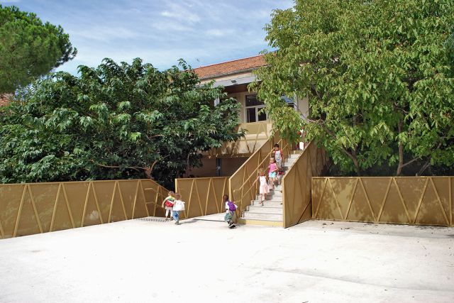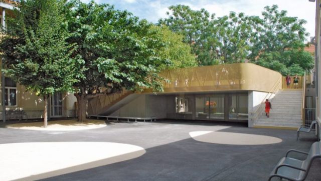- Unification des cours (rattrapage différence de niveau entre les 2 cours, réfection des sols intégralement des 2 cours, séparatif entre les 2 cours devant jouer le rôle de préau et qui intégrera la tour escalier-ascenseur)