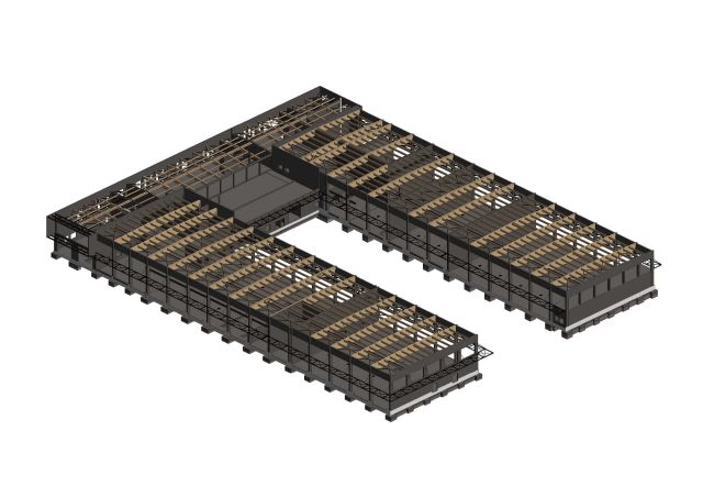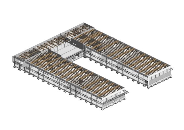 - La structure est composée d’ossature en béton armé avec des murs isolés pour les zones chauffées, et de structure bois en lamellée collé pour les ateliers et les magasins. Fondations semi-profondes et dalle portée recevant des charges roulantes.