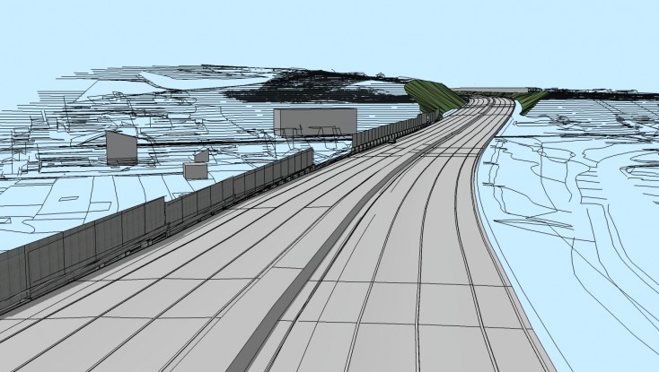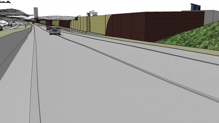 Réalisation d’un écran acoustique de 600 ml. Hauteur variable de 2 à 8 mètres par rapport à la plateforme. Fondations profondes