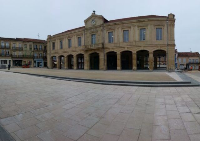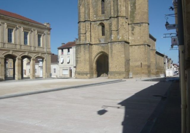 - Place de la Mairie: Place du marché en sable, trottoirs en béton désactivé, stationnements, dallage en pierre mobilier urbain, plantations