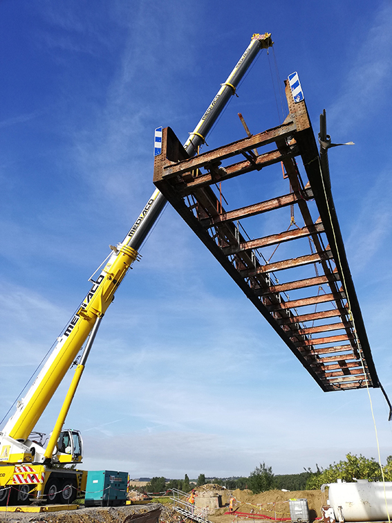 Réalisation d’un passage supérieur d’une longueur de 26 mètres composé de deux poutres latérales métalliques et d’un hourdis en béton armé réalisés sur prédalle. Le pont est fondé à l’aide de micropieux.