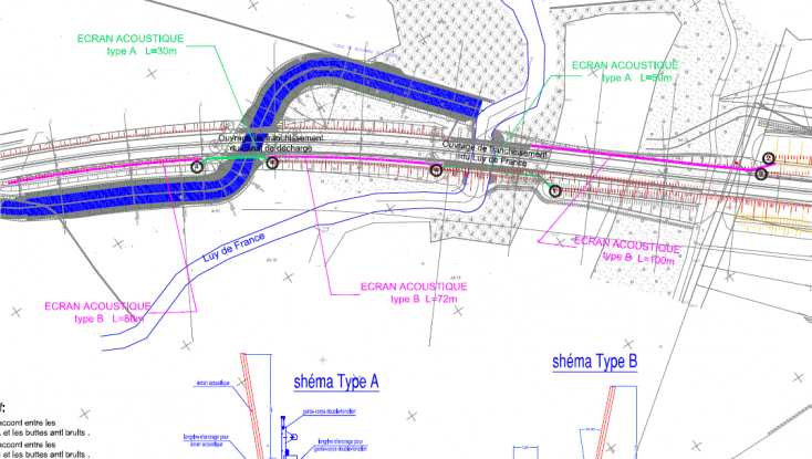 - TYPE B : à l’extérieur des ouvrages, ils seront positionnés sur un soubassement en béton type DBA élargi. La hauteur totale de l’ouvrage (DBA + écran) sera de 3,50m, en dimension projetée sur le plan vertical. Ces écrans seront mis en œuvre :